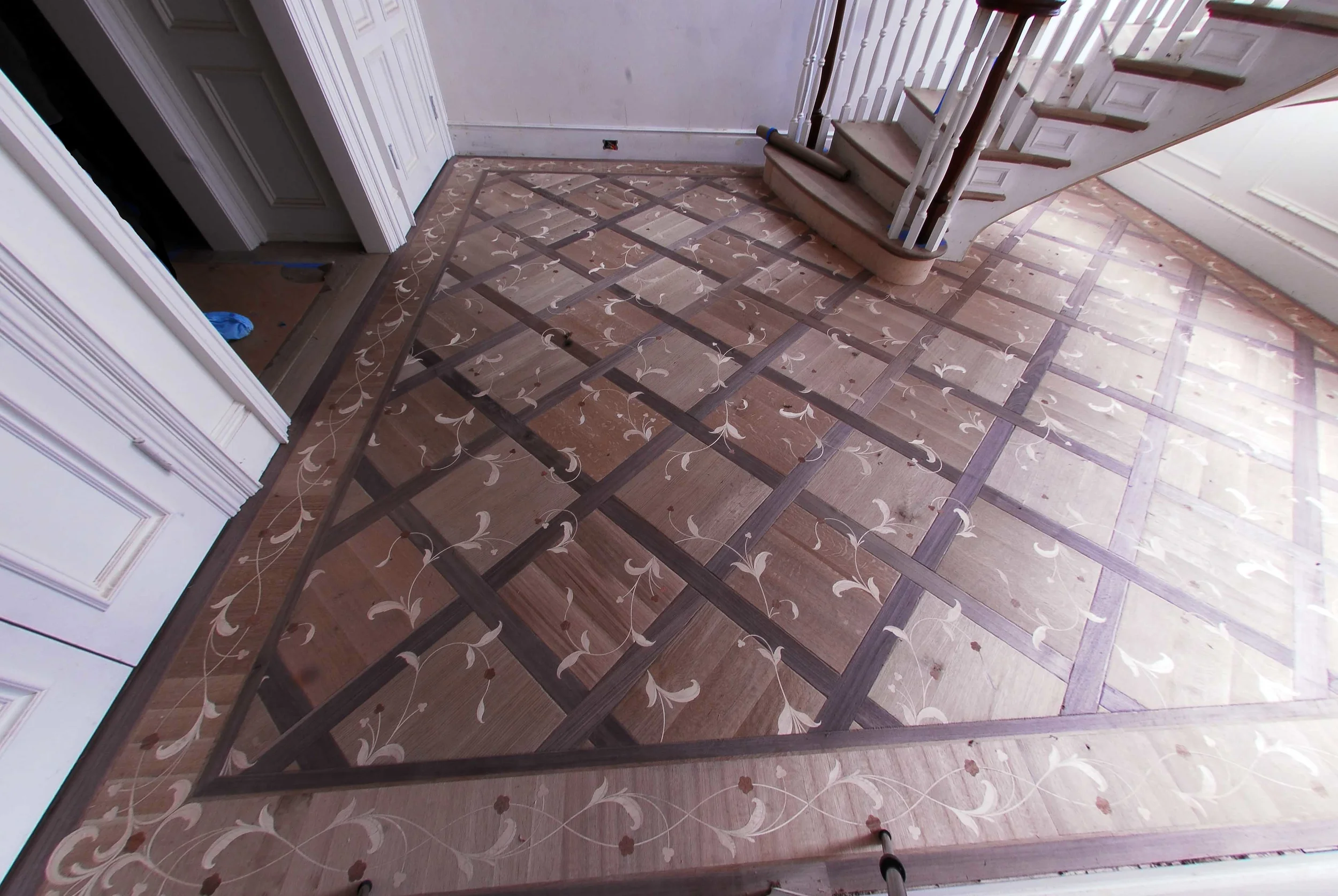 These floors were reclaimed after the flood of their house. we cut them up into a great looking basketweave floor . We distressed and aged the parquets then triple oiled and waxed them.